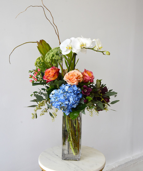 Intrigue is a modern floral arrangement with a confident, understated presence. Designed in a tall ribbed cube vase, this composition features a graceful white phalaenopsis orchid rising above a thoughtfully balanced mix of peach and orange roses, blue hydrangea, hellebore, hypericum, and seasonal greens.