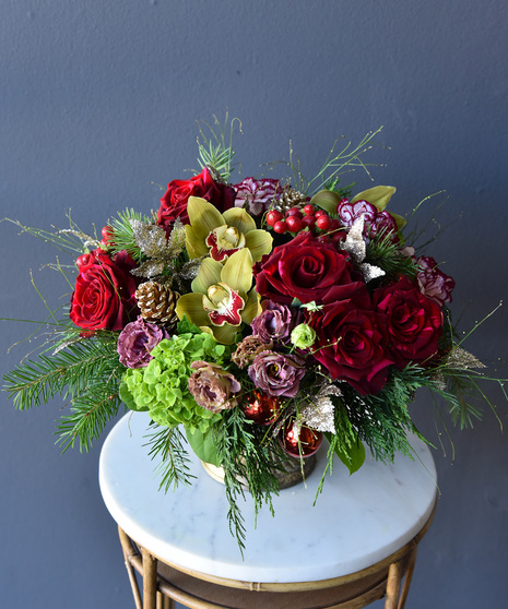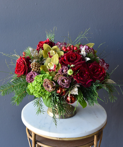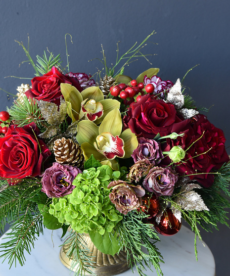 Bold yet graceful, Crimson Frost captures the warmth of the holiday season. Rich red blooms—roses, elegant cymbidium orchids, lisianthus, berries, pinecones and seasonal accents—are arranged with touches of winter foliage and silver shimmer, all presented in an antique gold compote vase.