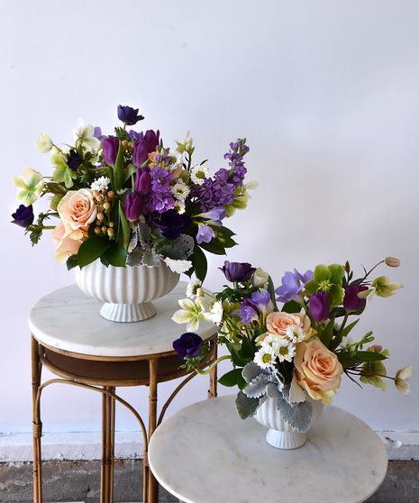 Like a beautifully composed piece of music, Floral Concerto brings together color, texture, and movement in perfect harmony. This free-flowing arrangement features soft peach roses, graceful purple tulips, fragrant lavender stock and freesia, dramatic anemones, airy white chrysanthemums, fluffy hydrangea and seasonal foliage.