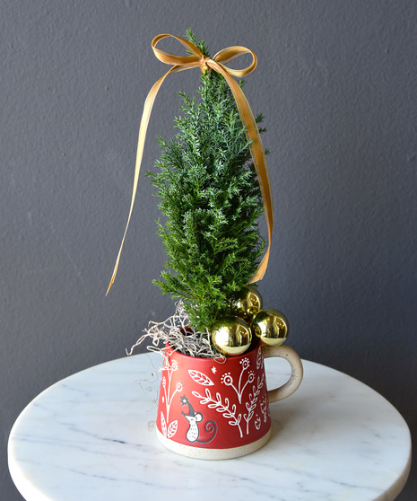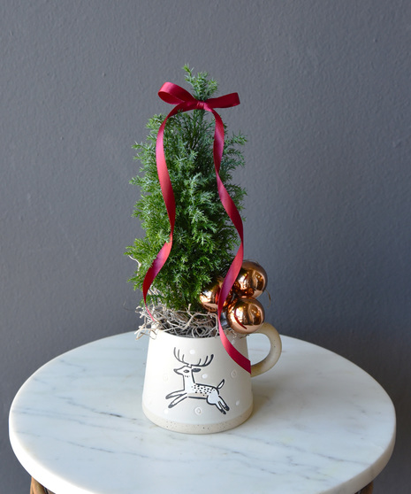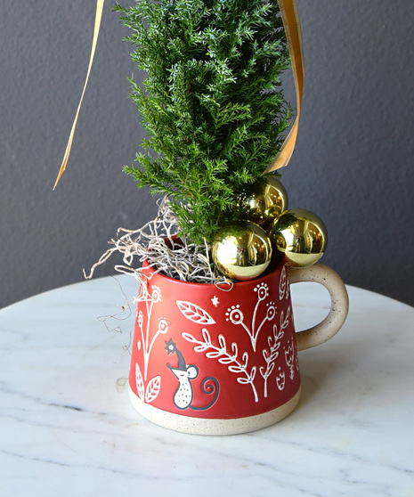 Charming winter critters frolic in a etched and painted design on a ceramic mug of a cozy mouse and leaping deer under a fresh cypress pine tree cascading ribbon and trim.