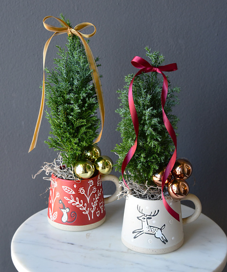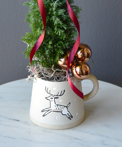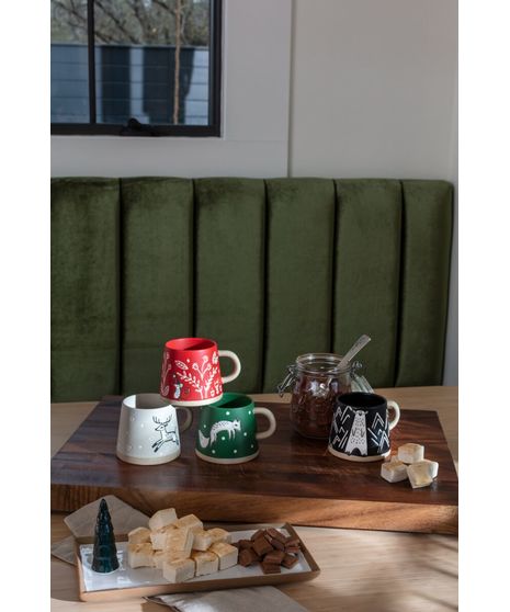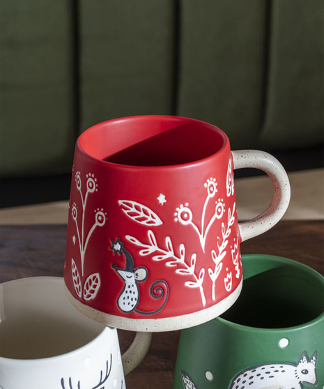 Nordic Critter Tree Mug Charm the Holidays with a cozy mouse or leaping deer under a holiday tree and cascading ribbon.