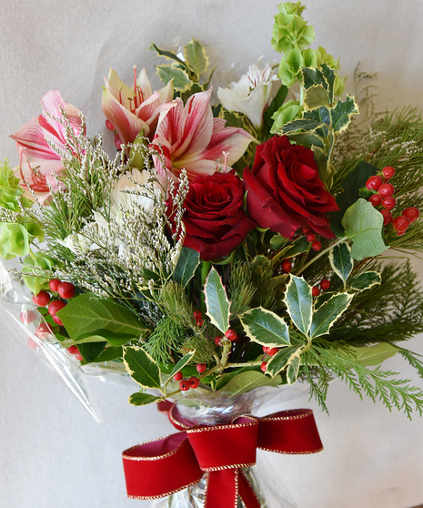 Celebrate the happiness of the season with Oh Joy, a festive winter hand-tied bouquet gathered in a garden-inspired style. Rich red roses, dramatic variegated amaryllis, cheerful holly, and soft white alstroemeria come together with vibrant chartreuse Bells of Ireland, accent blooms, evergreen pine, and seasonal foliage. Finished with a luxurious gold-trimmed velvet ribbon, this bouquet captures classic holiday beauty with a joyful, modern touch. Perfect for gifting, celebrating, or bringing a burst of seasonal cheer into any space.