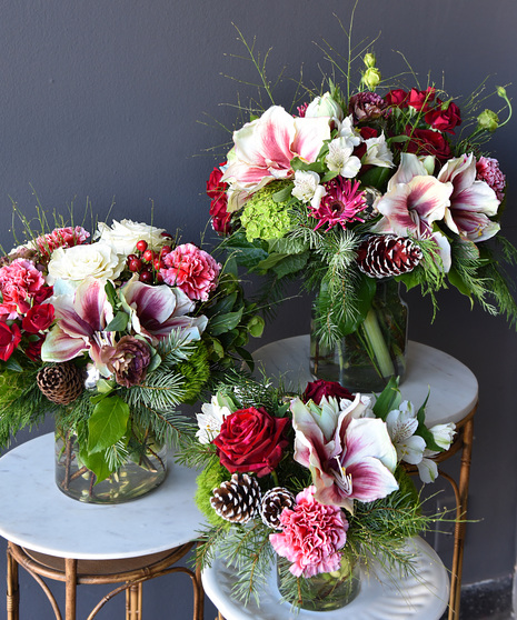 The winter treat of the season, a peppermint swirl! It's the sweet spice to holiday greetings and gatherings. The palette of festive amarylis, holiday red roses, variegated peppermint carnations, hydrangea, hypericum berries, lisianthus, pinecones, seasonal foliage and sparkling wishes are designed in a glass vase. Happy Holidays!