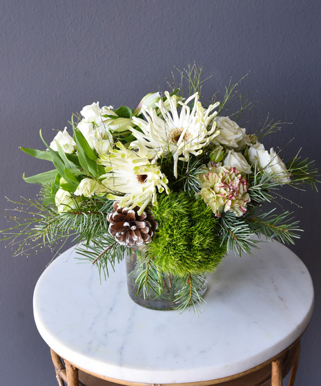 Winter grace in bloom. Snowlight's creamy roses, white gerbera, alstroemeria, carnations are paired with silvery accents and winter foliage, all arranged in glass vase that glows with warmth. Lovely with the addition of votive candles too.