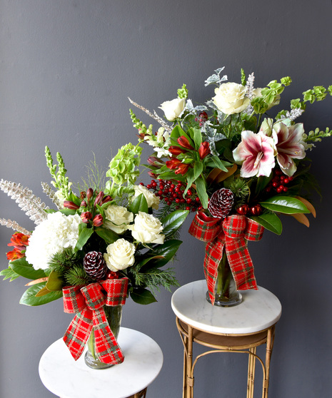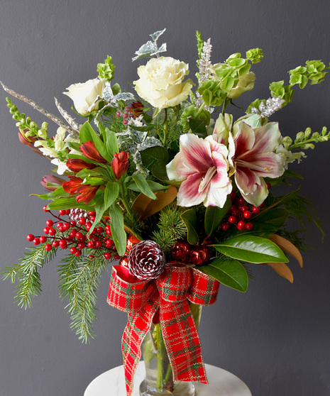 A combination of modern artistry and vibrant hues will provide a cheerful attitude to any celebration. The Splash of Winter transforms any space with the vibrant hues and festive spirit of the winter season. This arrangement is an artful blend of classic beauty and modern flair, featuring radiant roses, classic snapdragons, alstroemeria, hydrangea, and the unique green charm of the bells of Ireland. The Grand features a blooming amarylis. Adding texture and depth, winter foliage complement the fresh flowers while shimmering accents and rustic pinecones infuse the design with holiday magic.
