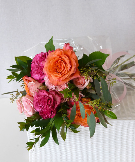 Sweetie Pie is a vibrant blend of playful pink and citrus orange roses presented with seasonal foliage as a hand-tied bouquet.