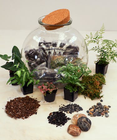 Create a garden ecosystem under glass with a terrarium kit to gift or for someone to make. The kit includes a link to a video on how to design a terrarium.