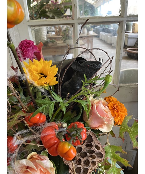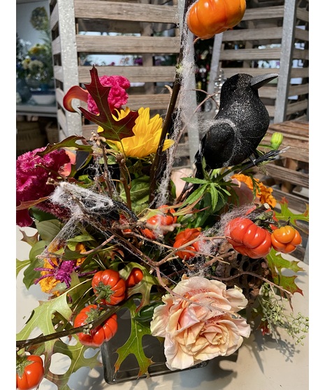 Embrace the bewitching beauty of Halloween in style with Wicked Bloom — a captivating mix of pumpkins, sunflowers, and roses, dried pods, mini pumpkins accented with spooky details of spiders and a mischievous black bird or rat bring a playful, spooky touch to the design. Presented in a moody leaf-lined glass cube.