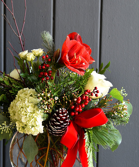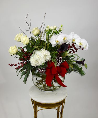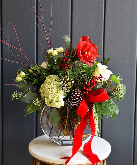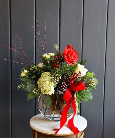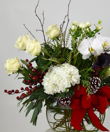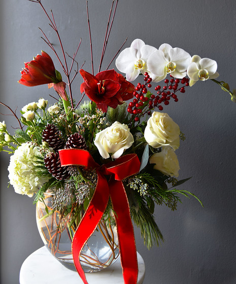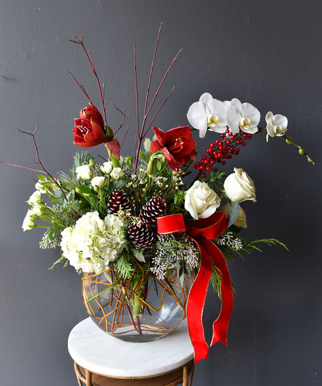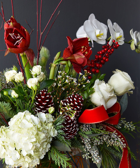 The Winter Soiree from Ah Sam Floral Co. is the perfect way to celebrate the most beautiful time of the year. This exquisite arrangement combines the season's magic with rich, festive blooms that will enchant you. Bold red amaryllis blossoms stand tall and proud, evoking the warmth and joy of holiday gatherings. Snowy white phalaenopsis orchids gracefully cascade through the arrangement, their delicate petals dancing like sugar plum fairies across a winter wonderland. Accented with vibrant red roses, green hydrangea, pinecones, and lush winter foliage, this design offers a sophisticated blend of color and texture. Magnolia leaves and seasonal greens bring in a touch of the outdoors, while a golden vase and ribbon add a festive sparkle that elevates the arrangement to pure elegance.
