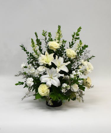 Symbolizing humility and innocence, this white-on-white arrangement makes it appropriate for conveying heartfelt reverence.