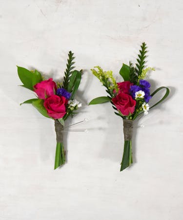 "You and I" features two special boutonnieres to adorn the jacket lapels for a celebration of your special day. Select a romantic neutral or a vibrant palette of florals and foliage wrapped stems with one or two pearl pins.