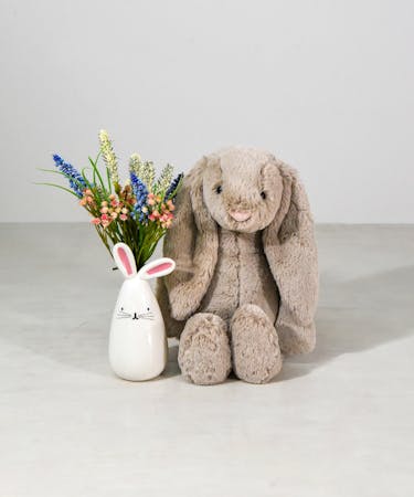 Welcome spring with something for everyone. A Jellycat cuddly bunny and a cute bunny vase with silk flowers. Bunny color will be either brown or white.