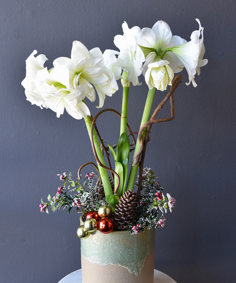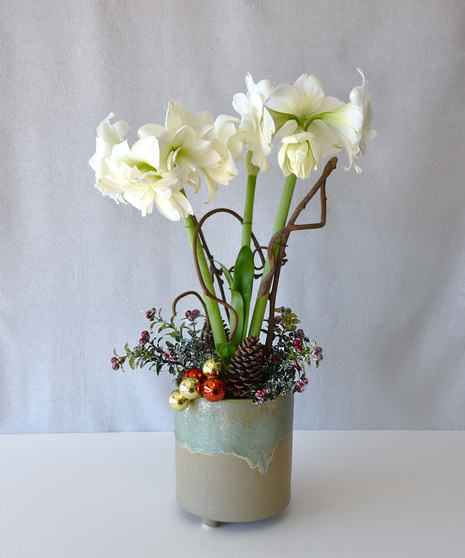 Blossoming from budded stems are double stemmed trumpet-shaped elegant white amaryllis blossoms. Amaryllis easily elevate the spirit of the holidays. This holiday plant is perfected by cheerful embellishments with moss, festive embellishments and branches in a seafoam green and cream footed ceramic vessel.