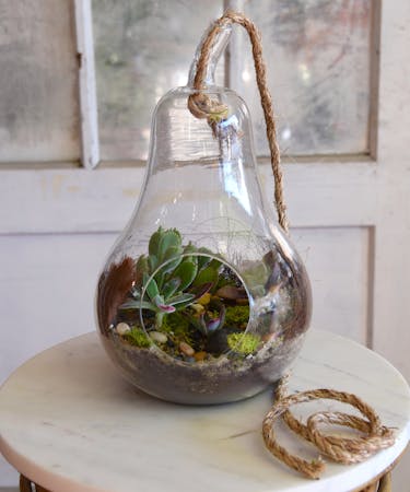 Charm them with a hanging glass terrarium of three varieties tillandsia and natural accents. Showcase the terrarium on a tabletop or hang it by the included rope, approximately 12"—14".