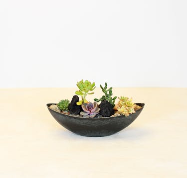 A textual collection of succulents and natural elements designed in a contemporary boat-shaped container. The variety of color and textures is a perfect selection for a home or office.