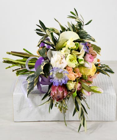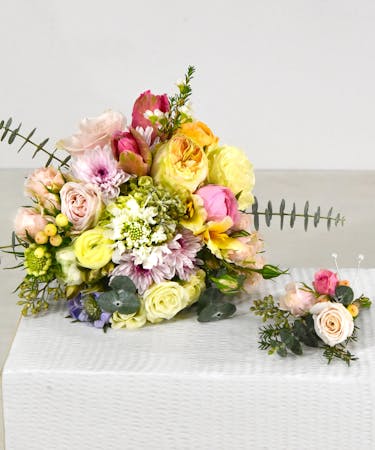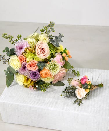 Blushing with charm, Happy Together wedding are pastel floral bouquets featuring soft shades of roses, multi-blossom spray roses, with a lovely selection of seasonal blooms and accent flowers and foliage. Neatly tied and finished with ribbon wrapped stems. Paired with matching boutonnieres. Our Happy Together wedding flowers will be seasonal flowers selected by our wedding designers without specific flower requests.