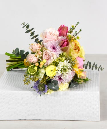 is blushing with charm featuring roses, multi-blossom spray roses, with a lovely selection of seasonal blooms and accent flowers and foliage. Neatly tied and finished with ribbon wrapped stems. Our Devotion Wedding will be seasonal flowers selected by our wedding designers without specific flower requests.